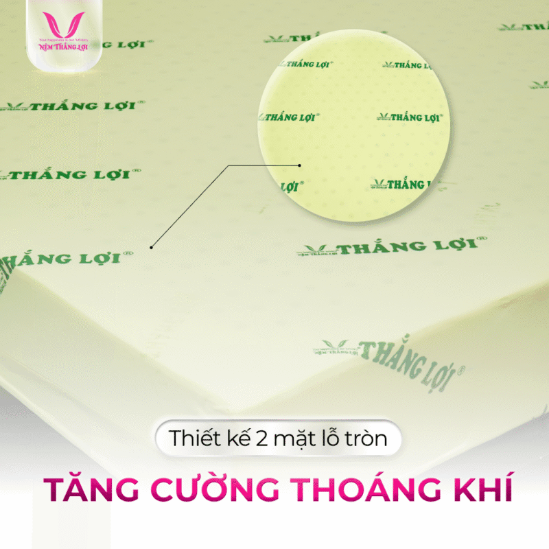 Với hàng trăm lỗ thông hơi trên cả hai mặt, Nệm Cao Su Non Thắng Lợi giúp thoáng khí và thoát ẩm hiệu quả. Nhờ đó, nệm luôn khô ráo và mát mẻ, điều kiện lý tưởng cho một giấc ngủ sâu không bị gián đoạn bởi cảm giác hầm bí. Cấu trúc này còn giúp ngăn chặn sự phát triển của vi khuẩn và mốc, bảo vệ sức khỏe người dùng và kéo dài tuổi thọ cho nệm.