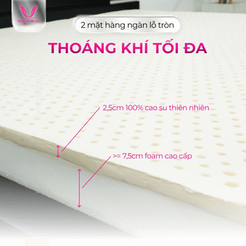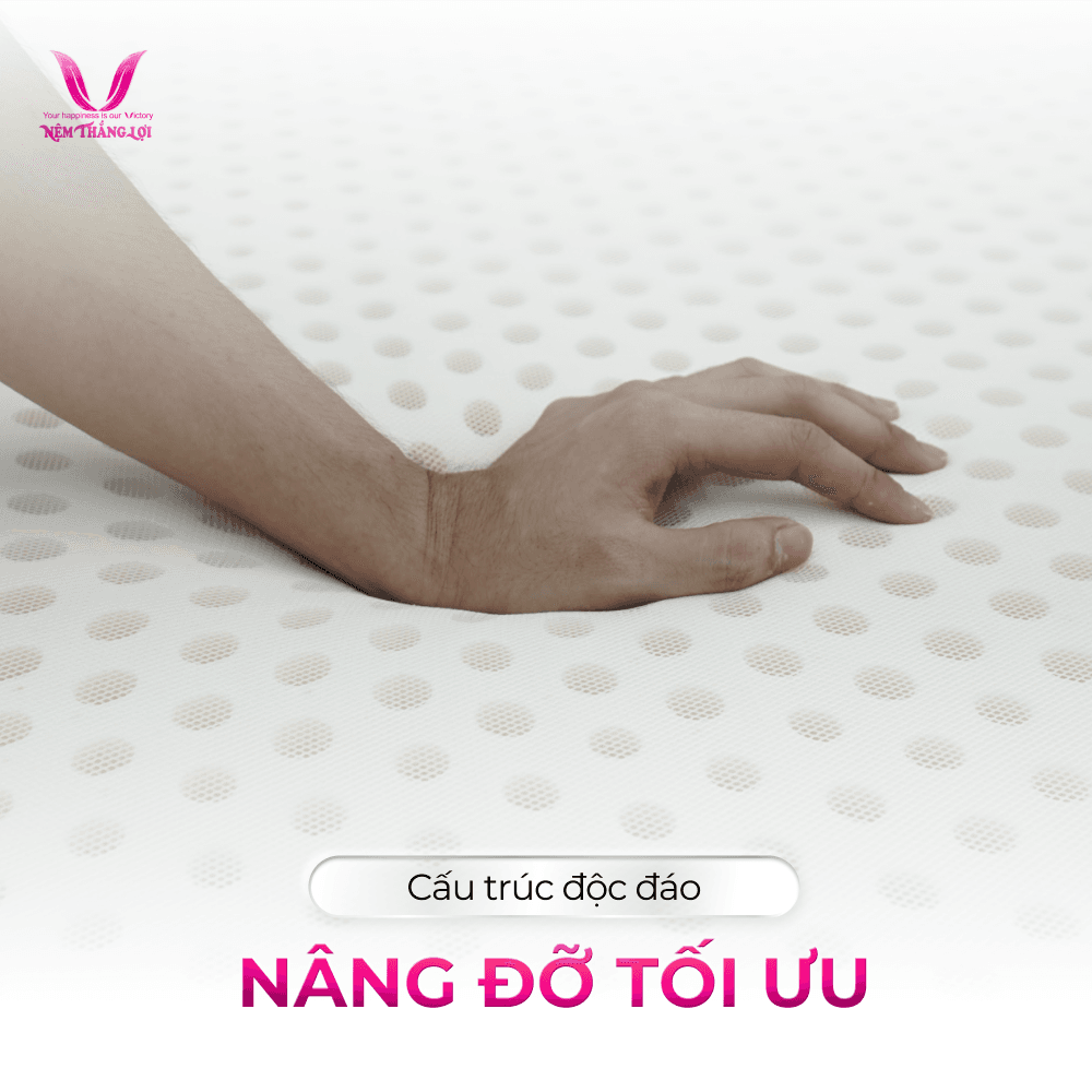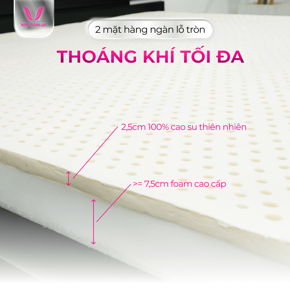 Cấu trúc | Nệm Super Win Thiên Nhiên Thắng Lợi được thiết kế với 2 lớp mặt trên 2,5cm cao su nguyên khối hàng trăm lỗ tròn nhỏ thoáng khí mềm mại, mặt dưới 7,5cm foam cao cấp lỗ nhỏ thoáng khí |