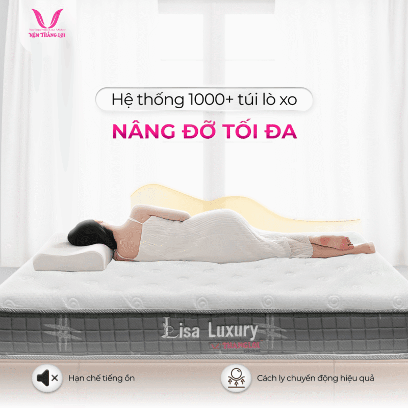 Nệm lò xo túi độc lập Lisa Luxury Thắng Lợi là sự kết hợp hoàn hảo giữa công nghệ hiện đại và thiết kế sang trọng. Với khả năng nâng đỡ tối ưu, phân tách chuyển động tốt và độ bền cao,